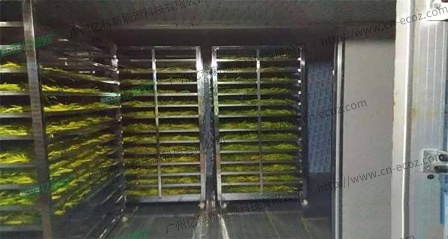 3、花蕾烘干:使用億思?xì)WECOZ空氣能熱泵黃花菜烘干機(jī),將蒸制好的花蕾均勻放在中溫范圍,在65℃的溫度下烘至五成干,推出來進(jìn)行回軟,再進(jìn)行第二次烘干,直至含水率為14%左右即可。每個批次烘干約10小時左右,4-5KG鮮花烘干得1KG干花。