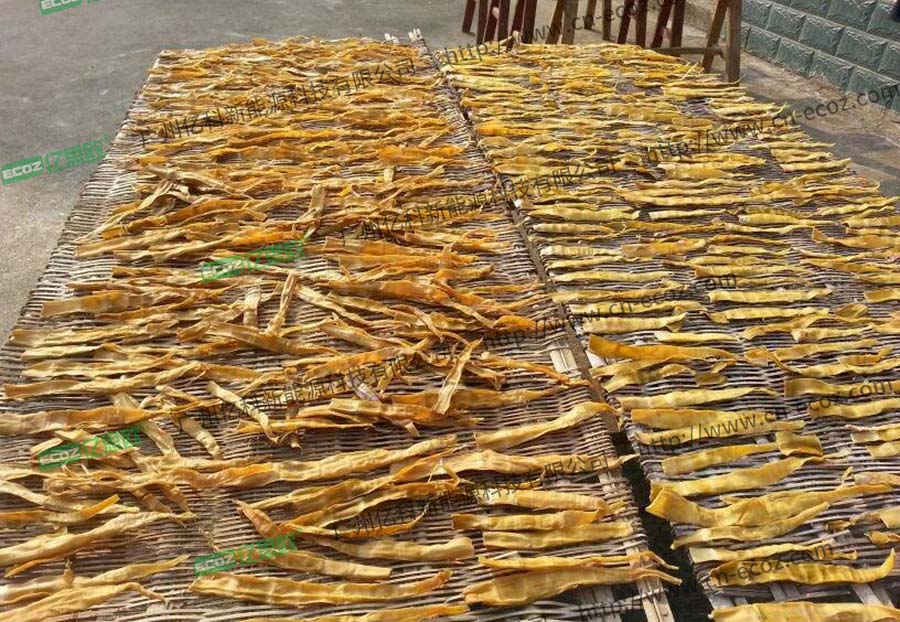 3、烘干:把蒸煮壓榨過的竹筍均勻地?cái)[放到烘干架上,放入烘干房,進(jìn)入烘干階段,烘干時(shí)間為34個(gè)小時(shí),直至竹筍呈金黃色。