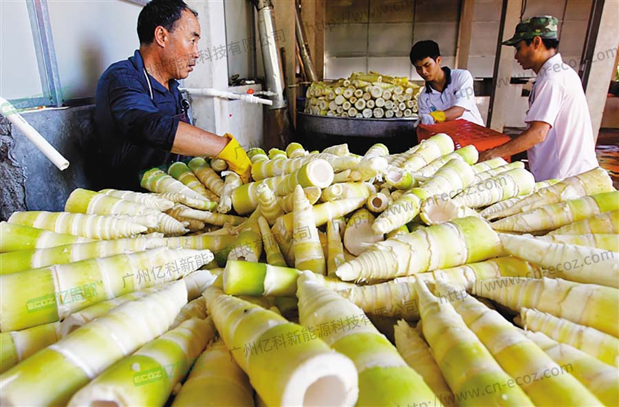 2、蒸煮漂洗:將清洗處理好的筍體放入墊有篾圈墊的連鍋木甑中,再加水用猛火煮2~3小時(shí)即可,標(biāo)準(zhǔn)為筍肉由白色變?yōu)橛癜咨S體變軟,可在竹筍節(jié)間插入鐵釬進(jìn)行檢驗(yàn)。注意每煮2~3鍋后要換水一次,否則筍干易變色,降低質(zhì)量和價(jià)值;煮熟的筍體從鍋里撈出后,放入在流水的木桶中用冷水漂洗,并晾干至竹筍表面水分蒸發(fā)。