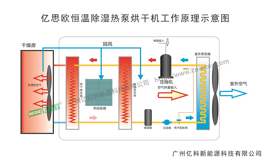 而億思?xì)WECOZ熱泵烘干機應(yīng)用逆卡諾原理,可將空氣中的熱量源源不斷轉(zhuǎn)移到烘干房對物料進(jìn)行“免費”烘干,其優(yōu)點自然是省電、能效高,但其缺點是需要建造空氣能熱泵烘干房,更適合大規(guī)模批量烘干。