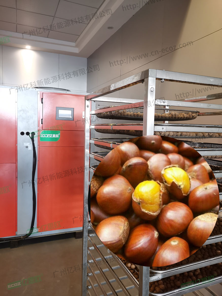 第四步把板栗烘干:板栗烘干目的是使?jié)づc果肉分離。將煮制好的栗果用清水沖洗掉表面粘附的調(diào)味液,將板栗放入物料托盤,插入物料車,推入熱泵板栗烘干房,板栗的耐受溫度比較高,可以將溫度直接調(diào)至75度進(jìn)行烘干,時間設(shè)定6-8小時,進(jìn)行連續(xù)排濕,栗果水分下降至30%時,澀皮與果肉分離,食用時容易剝落,且果肉不碎,干濕度適中。