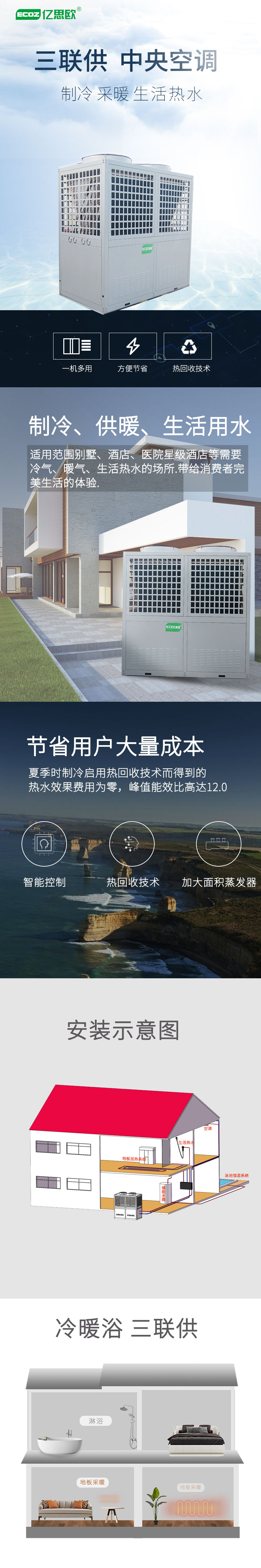 ECO億思歐研發(fā)的冷、暖、浴風(fēng)冷三聯(lián)供系列機組綜合能效比在6.0以上,高效節(jié)能,適用于冷氣、采暖及生活熱水的高端別墅、酒店等.一機多用,不僅給人類帶來更多的方便之處,并且更